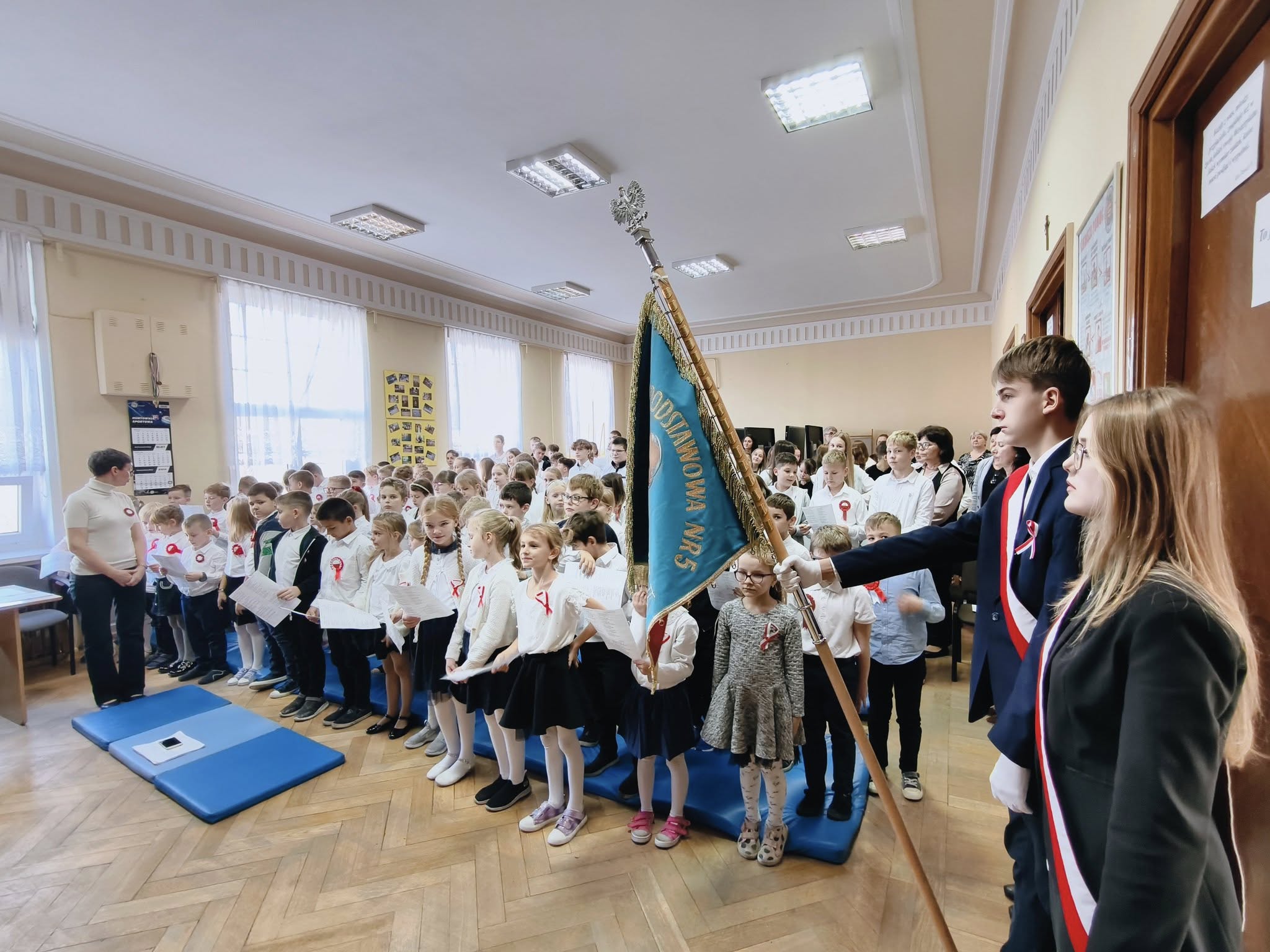 Uroczyste obchody Święta Niepodległości w naszej szkole. Jak co roku społeczność SP5 zebrała się w auli szkolnej, by uczcić rocznicę 11 Listopada 1918 r. Podczas występu królowały pieśni i piosenki, które towarzyszyły Polakom u zarania niepodległości. W trudnych