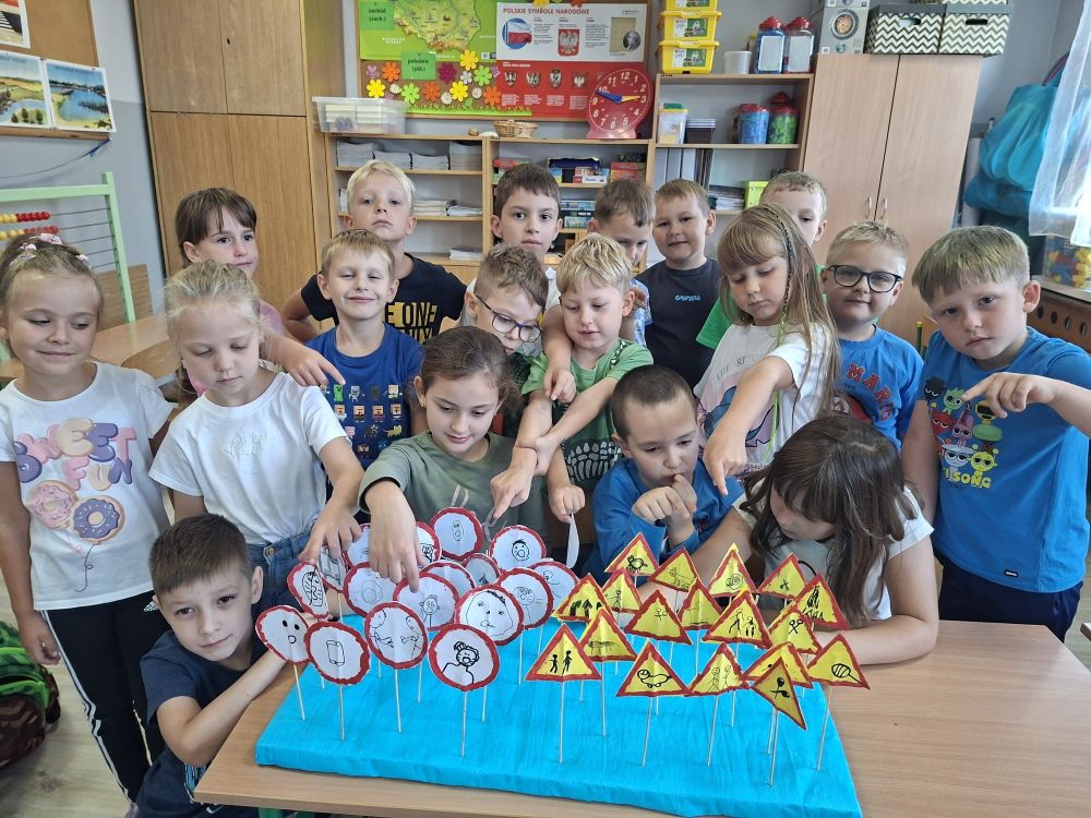 "Mój znak"-makieta 1A ze znakami według własnego pomysłu. Pierwszaki utrwalały dzisiaj znaki zakazu i znaki ostrzegawcze, a to efekt ich pracy...